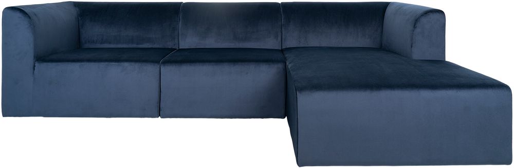 Oikealle päin oleva sohva sininen veluuri.