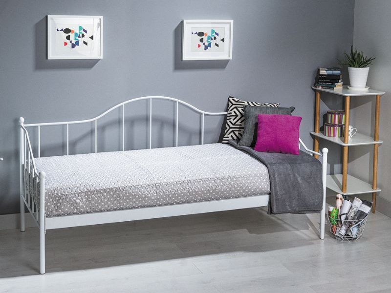 Tyylikäs sängynrunko, joka on valmistettu kokonaan valkolakatusta metallista ja sopii täydellisesti teinilapselle.