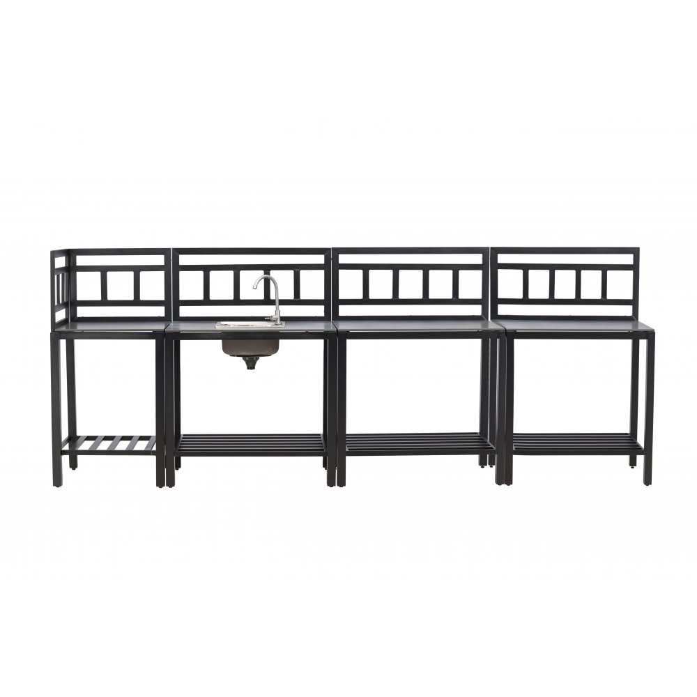 Kokonaisuus koostuu viidestä moduulista: kahdesta työpöydästä, penkistä, jossa on esiporattu reikä tiskiallasta varten, kulmamoduulista ja ruostumattomasta teräksestä valmistetusta altaasta hanalla ja viemärillä. Yhdistelmä luo tilavan ja käytännöllisen työtilan, jota voidaan helposti mukauttaa tilan ja tarpeiden mukaan. Kaikissa osissa on vakaa mustaksi lakattu alumiinirunko ja kestävät harmaan kiven pinnat, jotka tarjoavat sekä kestävyyttä että tyylikästä ilmettä.