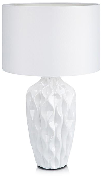 Klassinen Angela-pöytävalaisin. Vamistettu valkoisesta keramiikasta, valkoisella tekstiilisellä lampunvarjostimella ja valkoisella varjostinkehikolla. 1,5 metriä pitkä tekstiilipäällysteinen johto, jossa kytkin. Suuri lampunkanta (E27). Max 60W hehkulamppu tai tehoa vastaava halogeeni-, energiansäästö- tai LED-lamppu.