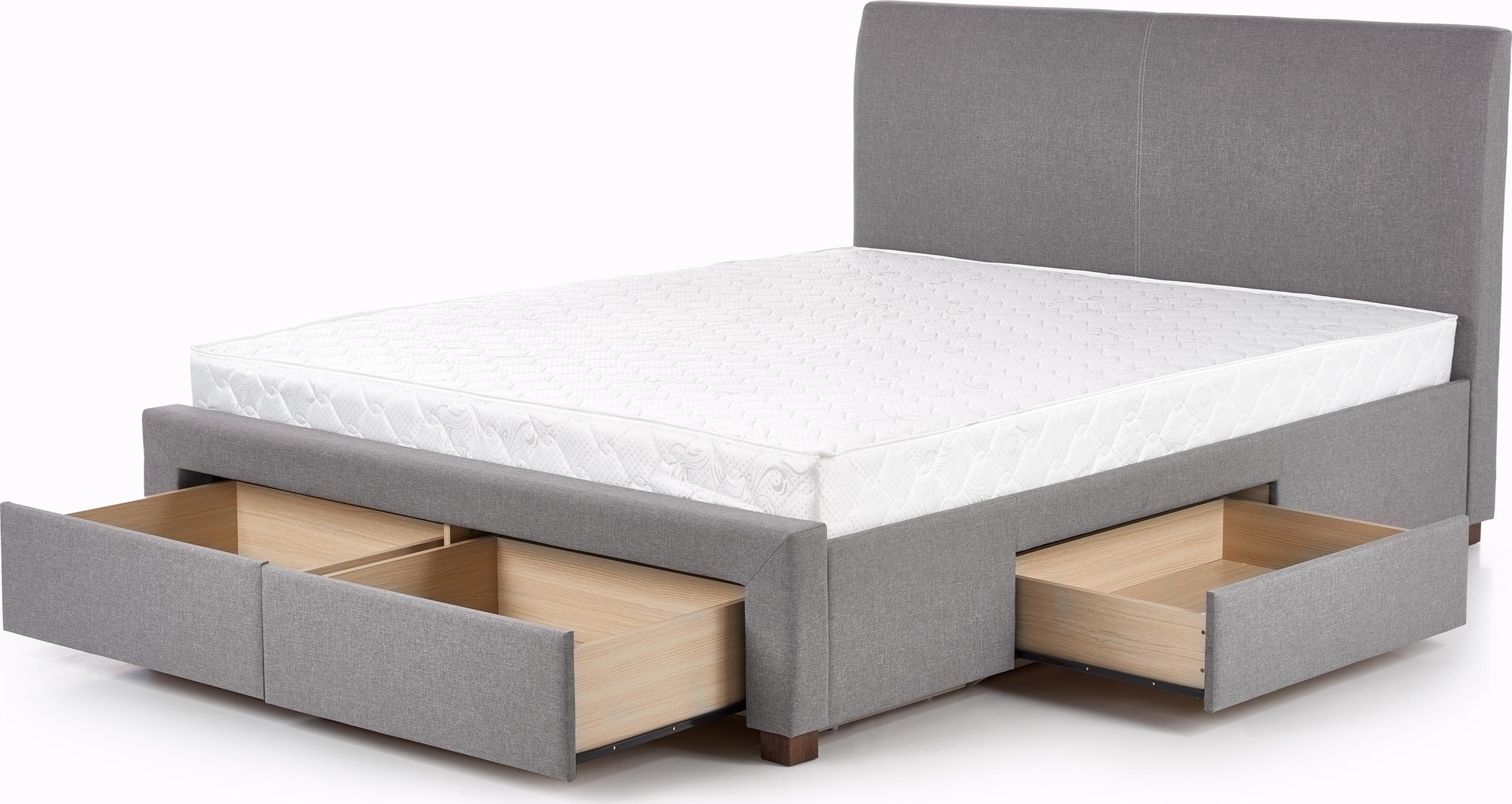 Sängynrunko, jossa säilytystila ja sängynpääty harmaata kestävää kangasta.