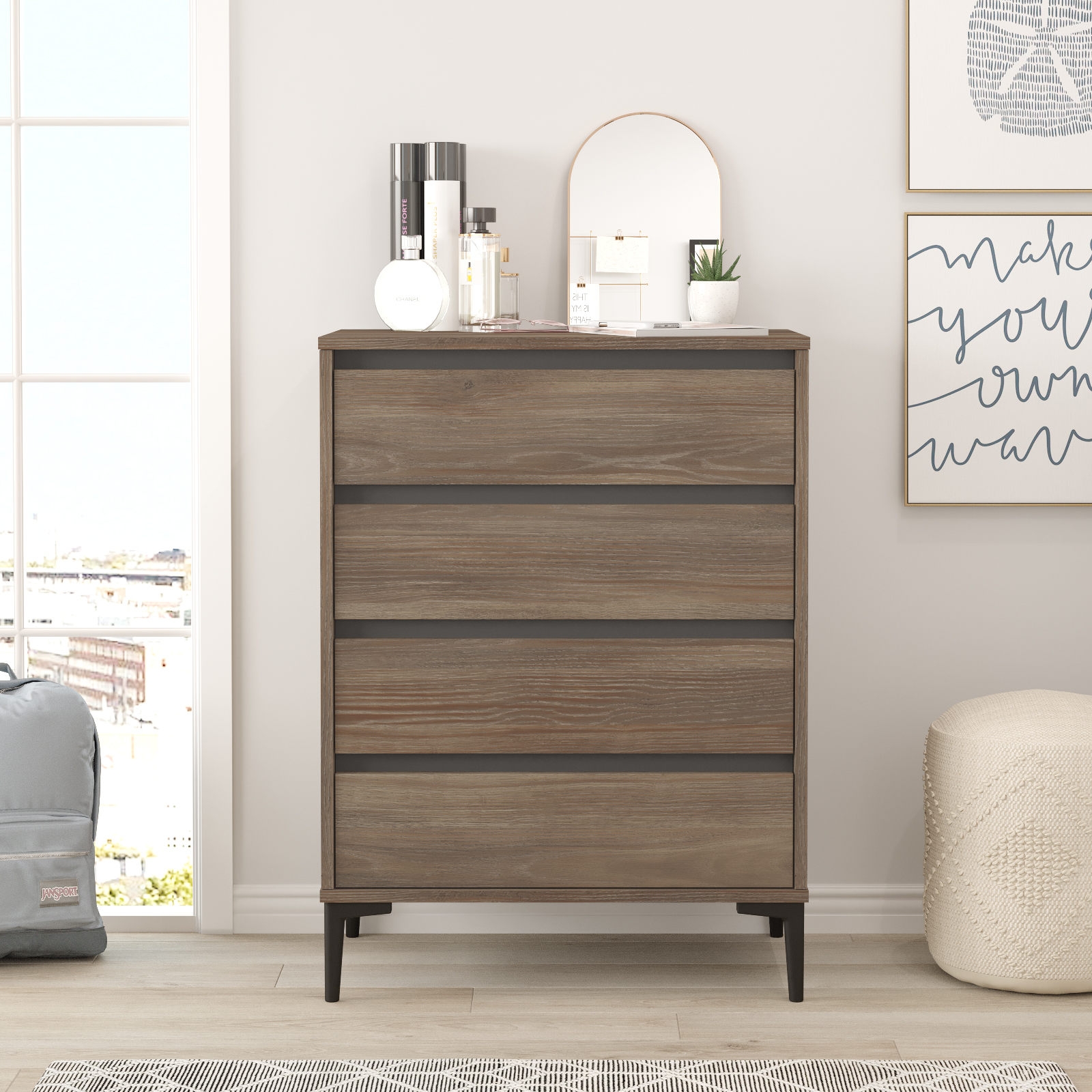 Arkku melamiinipinnoitettua lastulevyä. Muoviset jalat.
