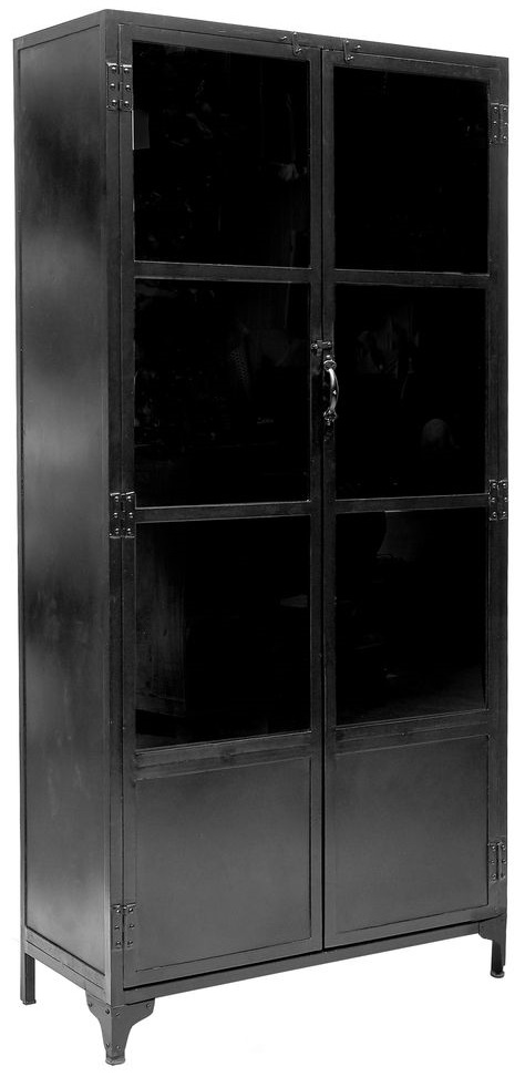 Vitriinikaappi mustaksi maalattua metallia, 2 kokopitkää lasiovea . Paljon säilytystilaa. Huonekalu, joka antaa maalaismaisentunteen materiaalivalintaa harkiten. Kestävä ja lujatekoinen.