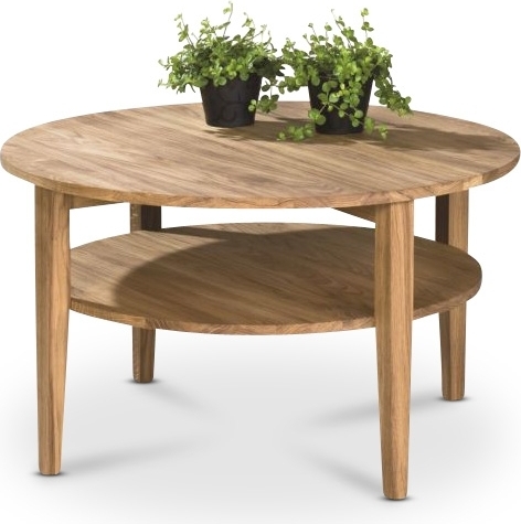 Pyöreä sohvapöytä, kestävä ja luonnollisen värinen öljytty tamme. Käytännöllinen hylly alla mahdollistaa joidenkin tavaroiden säilyttämisen, vaikka pöytä ei olisikaan niin suuri.