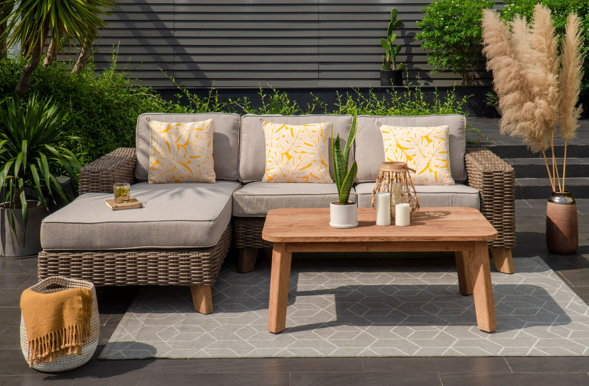 Loungeryhmä, jossa 1 divaani, 1 2-istuttava sohva ja 1 sohvapöytä. Divaanin ja sohvan runko on ruostumatonta alumiinia ja jalat FSC(TM)-sertifioitua tiikkipuuta. Verhoiltu käsin kudotulla synteettisellä rottinki- ja olefiinityynyillä. Sohvapöytä on valmistettu kierrätetystä tiikistä.