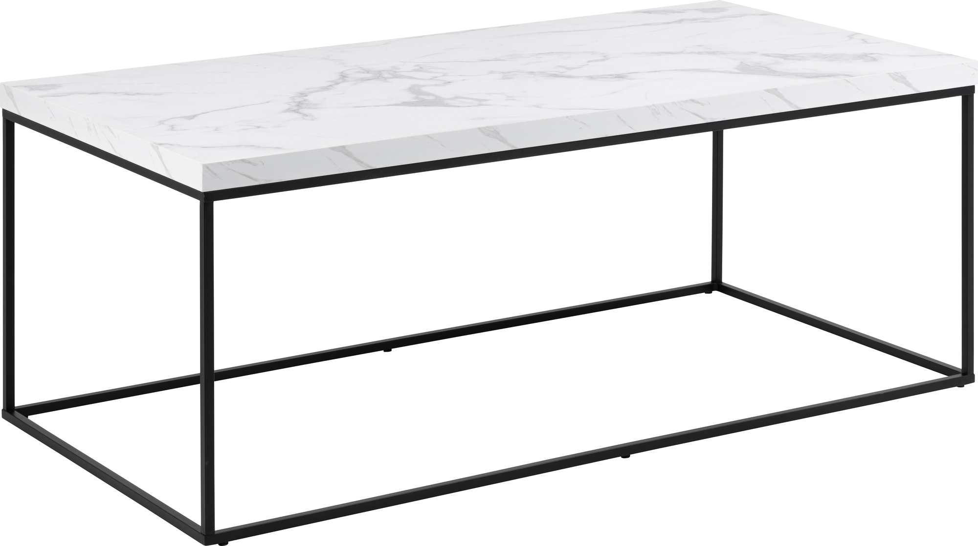 Sohvapöytä, jossa pöytälevy MDF-levyä ja pohja pulverimaalattua terästä. Marmorinäköinen pintakerros, valkoinen marmori harmailla suonilla (Carrara).