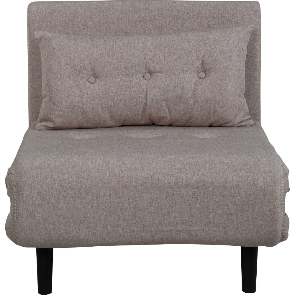 Metallista valmistettu nojatuoli, päällystetty polyesterikankaalla.