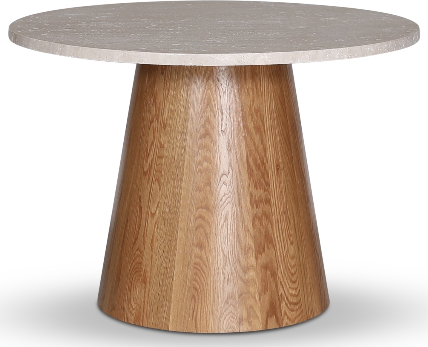 Batisse-ruokapöytä kartion muotoisella massiivipuupohjalla, jonka yläosa travertiinikiveä. Vintage-muotoinen kapeneva puinen pohja, jossa on luonnollinen puurakenne ja halkeamia.