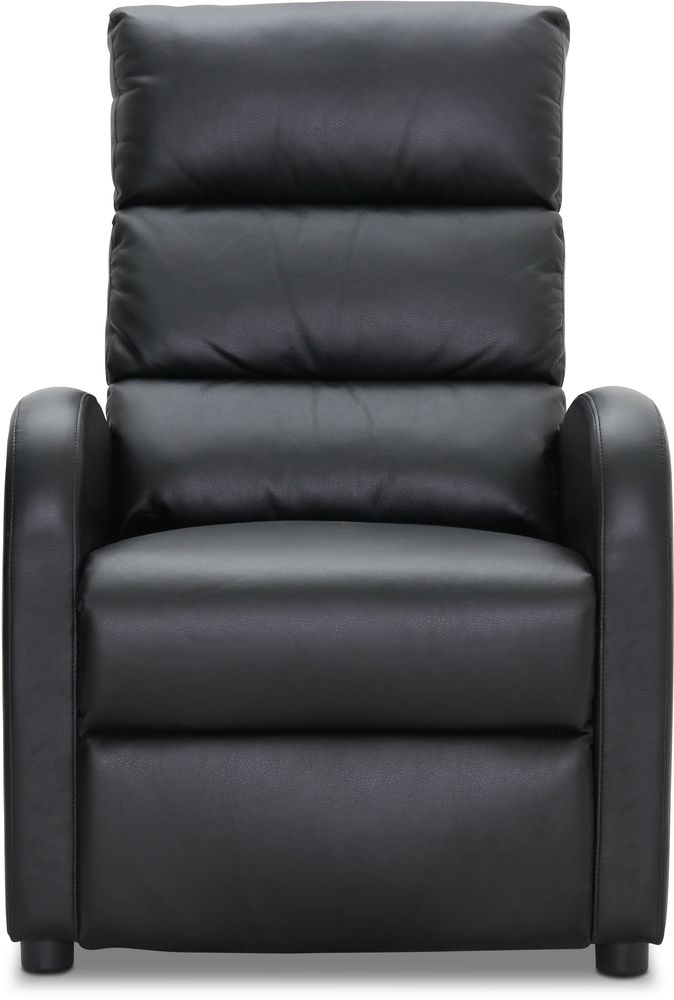 Ylellisesti muotoiltu ja mustalla nahkalla verhoiltu mukava nojatuoli. Push back recliner -toiminto.