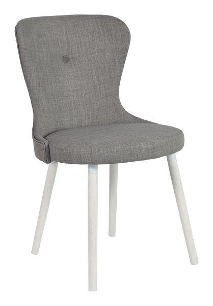 Moderni Betty-ruokatuoli. Pyöristetty selkänoja, istuin- ja selkäosa pehmustettu kylmävaahtomuovilla ja verhoiltu vaaleanharmaalla kankaalla lopullisen mukavuuden takaamiseksi. Pyöreät valkoiset puujalat.