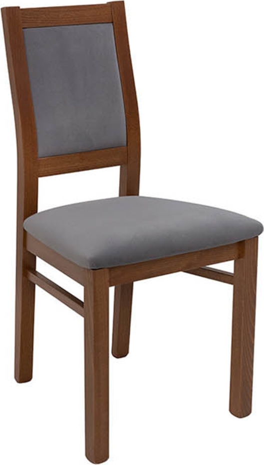 Puinen ruokapöydän tuoli kangasverhoilulla.
