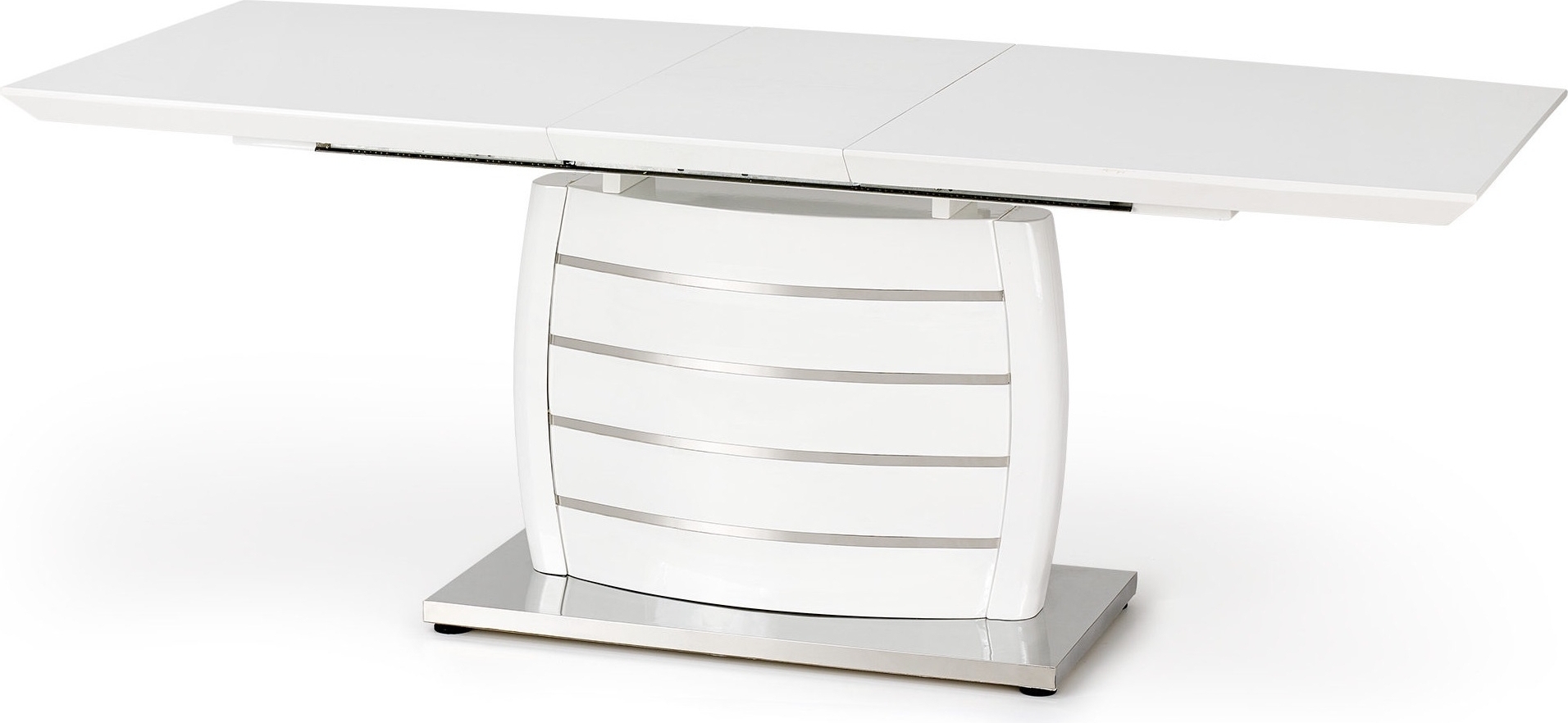 Elegantti ja moderni ruokapöytä. Runko on valmistettu metallista ja pöytätaso on valkoiseksi lakattua MDF:ää. Pöytää voi helposti jatkaa 160 cm:stä 200 cm:iin ja sopii siten erinomaisesti suuremmalle väelle.