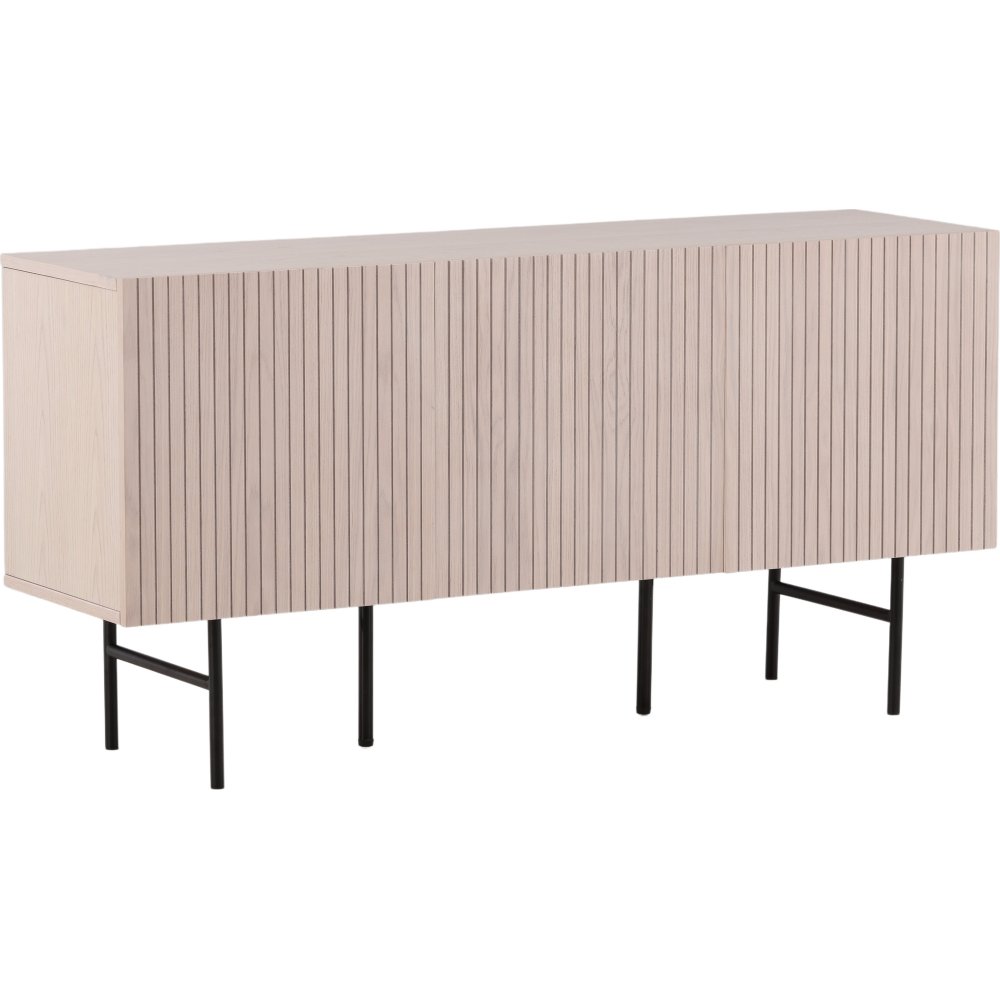 Skandinaavinen senkki ja tyylikäs muotoilu. Tässä senkkissä on kolme uurrettua ovea ja kaksi hyllyä, jotka mahdollistavat piilotetun säilytyksen. Se on valmistettu valkoiseksi rapatusta vanerista ja sitä nostavat sirot mustat teräsjalat. Käytä senkkinä kauniilla koristeilla ja kynttilänjaloilla tai TV-tasona olohuoneessa. Täältä saat huonekalun, joka on yhtä tyylikäs kuin älykäs.