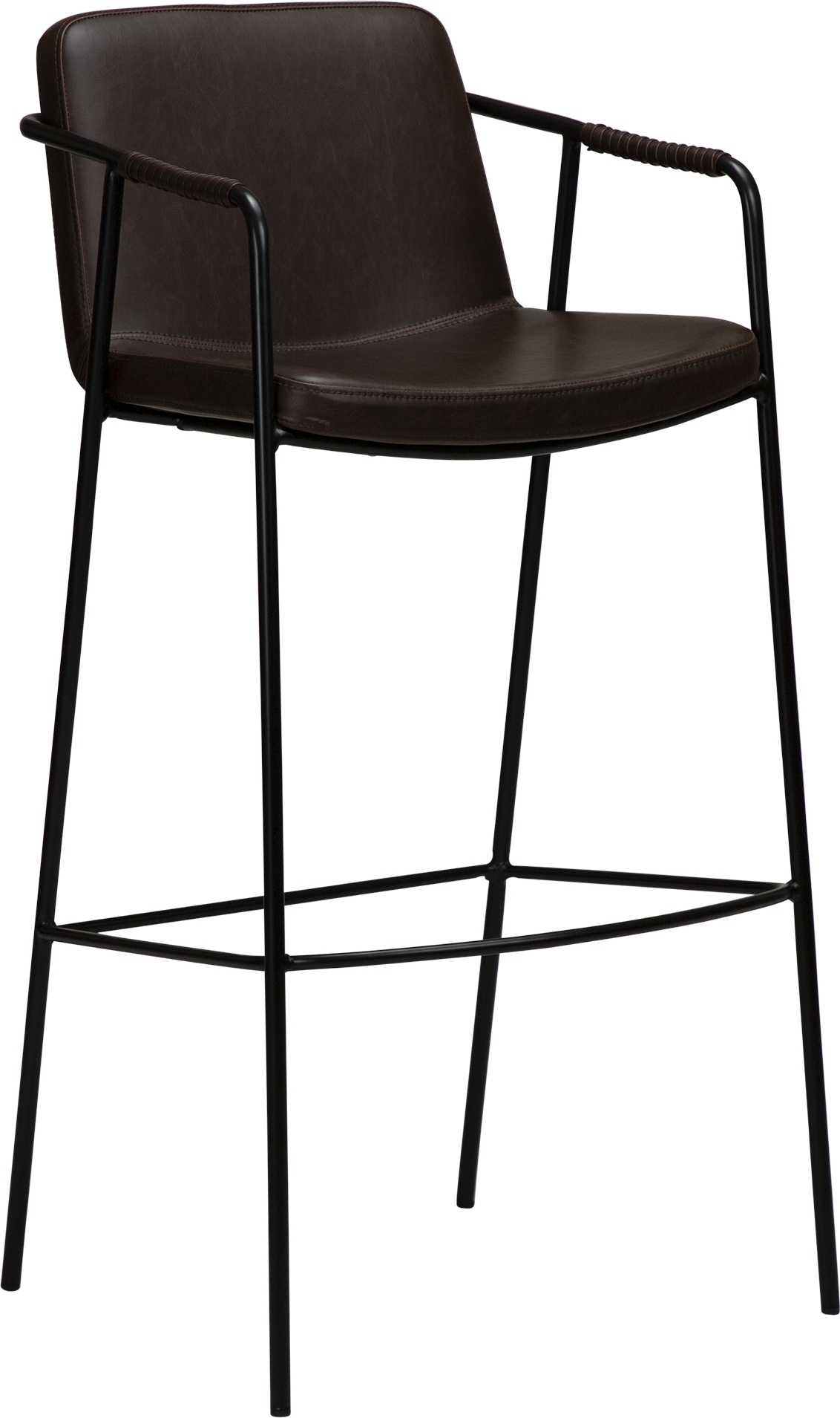 Hieno ja tyylikäs baarijakkara tanskalaiselta Dan-Formilta. Tuolissa on moderni retrotyyli ja se tarjoaa erinomaisen istumamukavuuden. Runko on valmistettu mustasta jauhemaalatusta metallista, istuin ja selkänoja pehmustettua keinonahkaa. Nahassa on mukava vintage-design ja käsinojat on tyylikkäästi päällystetty samalla nahalla, jotta käsivarret tuntuvat mukavammilta.