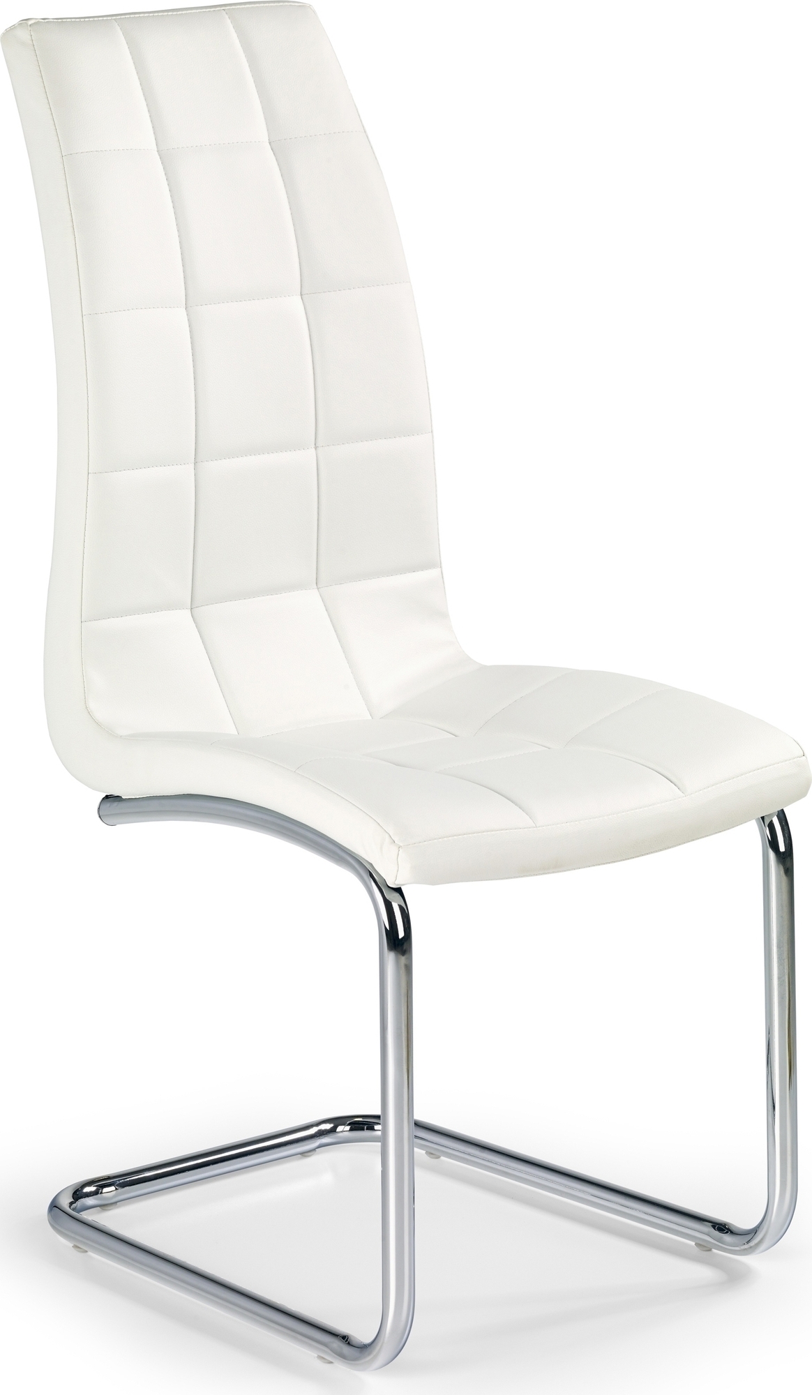 Mukava ruokatuoli modernilla designilla. Runko on valmistettu kromatusta metallista ja istuin on verhoiltu todella miellyttävällä valkoisella keinonahkalla lopullisen mukavuuden takaamiseksi.