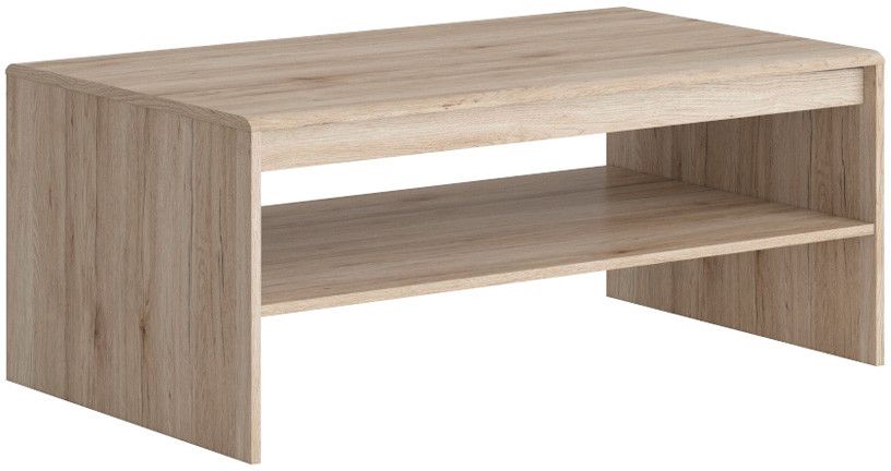 Hieno sohvapöytä tammi-imitaatiolla. Pöydän alapuolella on käytännöllinen hylly, jossa voi säilyttää lehtiä tai muita tavaroita, joita ei halua pitää pöydällä.
