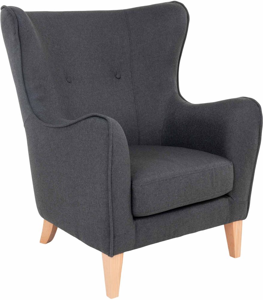 Tummanharmaa nojatuoli puisilla jaloilla.