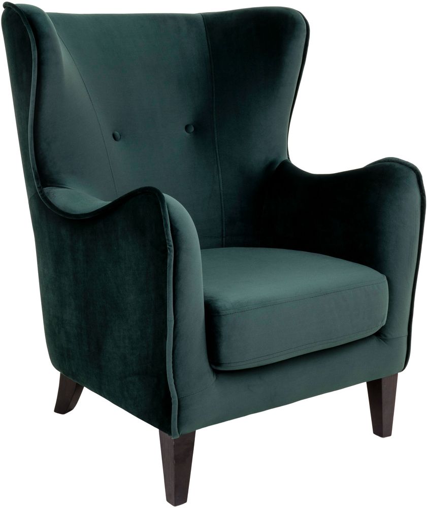 Nojatuoli tummanvihreää veluuria, mustat jalat.