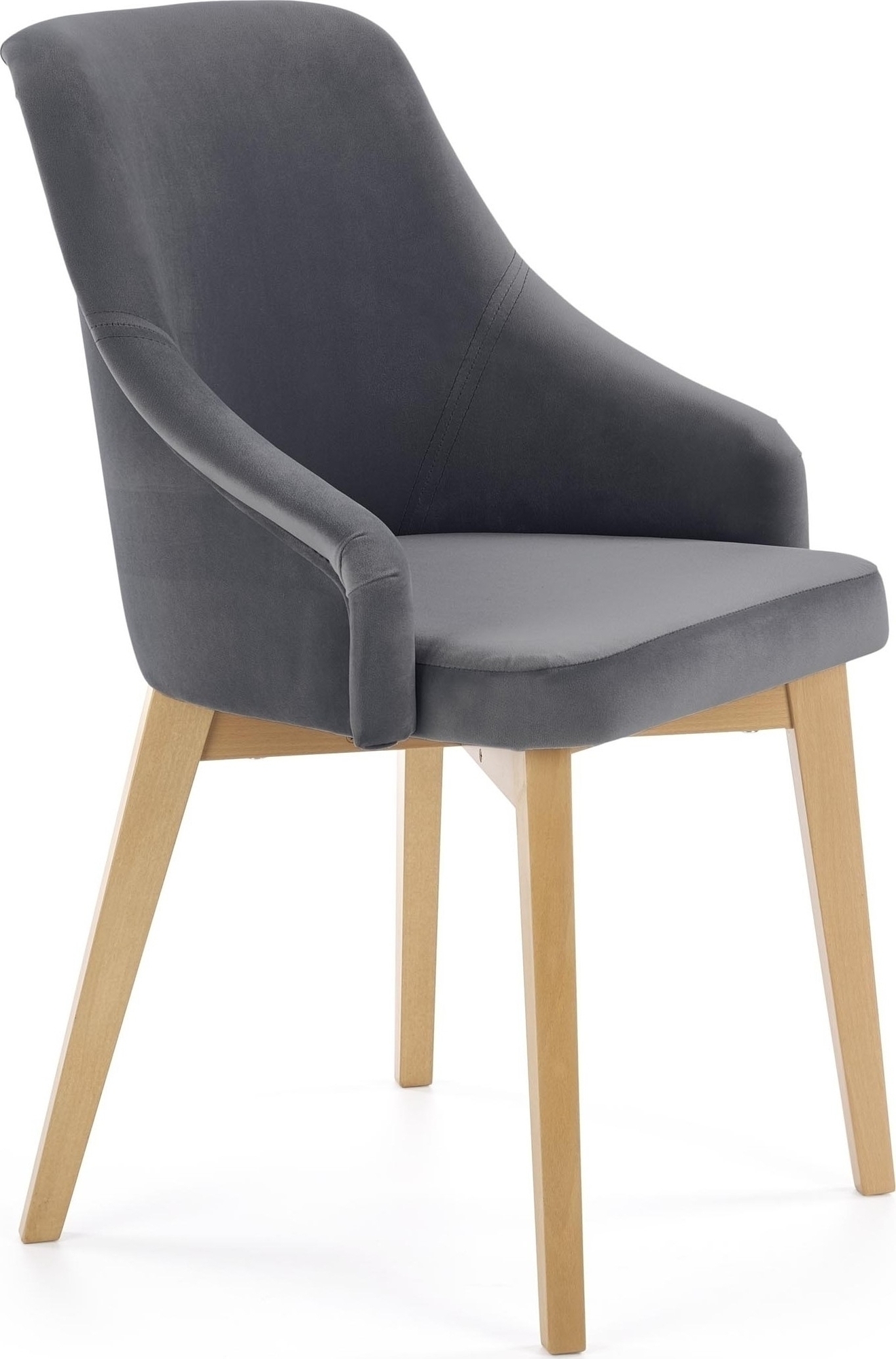 Tyylikäs ruokatuoli, jossa on moderni muotoilu. Tuoli on päällystetty erittäin miellyttävällä kankaalla maksimaalisen mukavuuden takaamiseksi ja jalusta on valmistettu massiivipuusta, jossa on luonnollisen puun ilme.