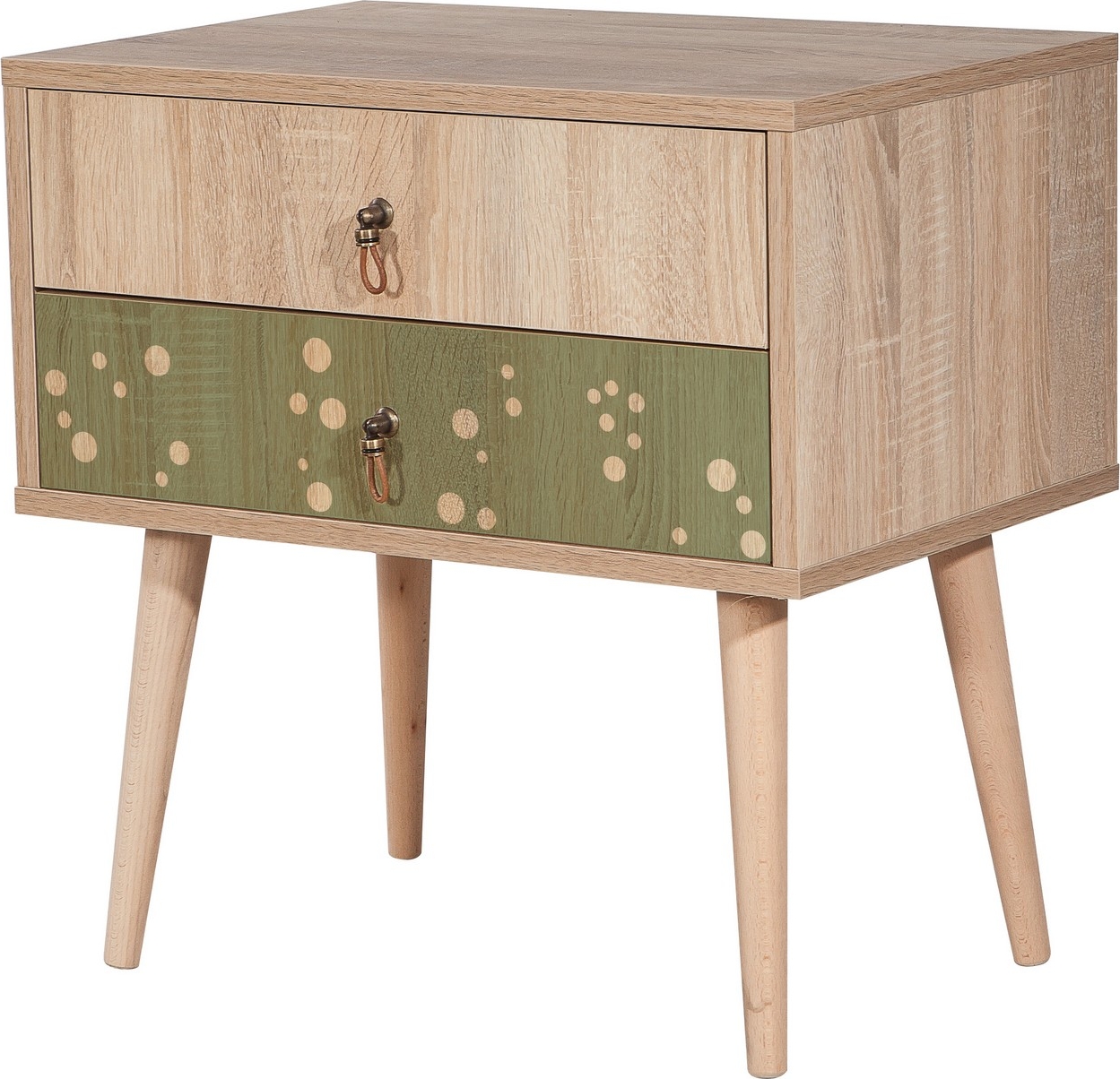Lastulevyinen yöpöytä massiivipuuta jaloilla.