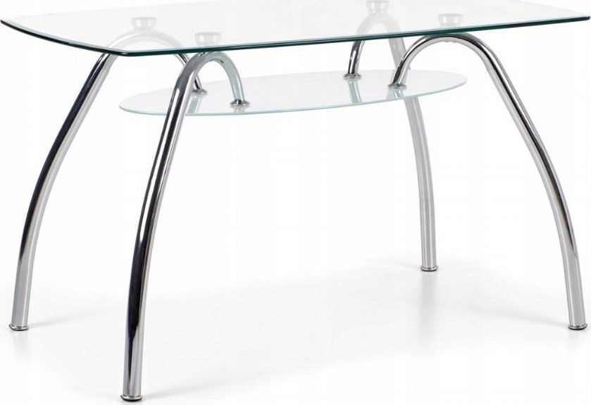 Upea ruokapöytä modernilla designilla. Pöytälevy on valmistettu kirkkaasta lasista ja varustettu käytännöllisellä himmeälasisella alahyllyllä, runko on valmistettu kromatusta metallista.