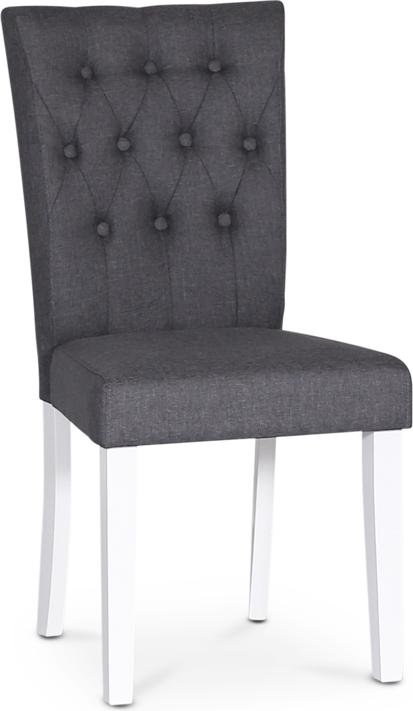 Kokonaan verhoiltu tuoli tyylikkäällä harmaalla kankaalla. Mukava ja upea tuoli vankalla vaikutelmalla ja sopii yhteen monen erilaisen ruokapöydän kanssa. Valkolakatut puujalat ja napit selässä! Kaareva selkänoja takaa hyvän istumamukavuuden!