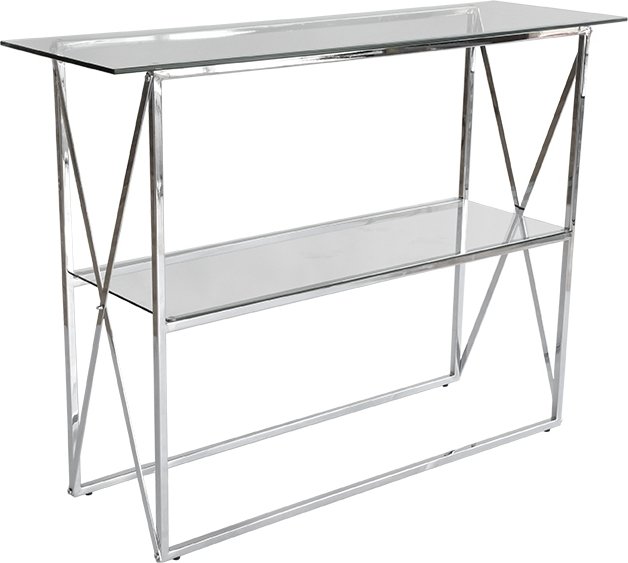 Konsolipöytä on helposti siirrettävissä. Pöydässä on lasilevy ja pöytä on kromattua metallia.