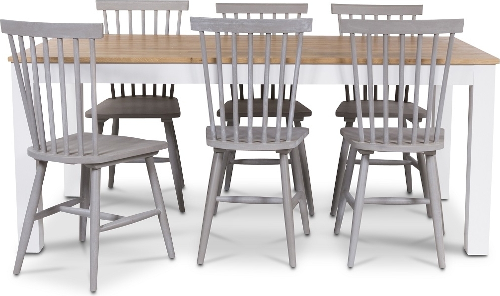 Dalarö-ruokailuryhmä tappituoleineen - 180 cm pöytä valkoinen/tammi ja 6 harmaata tappituolia