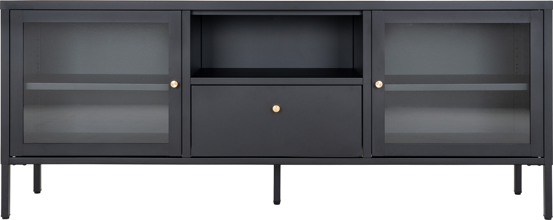 Teräksinen mediapenkki lasiovilla.