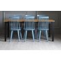 Dalsland-ruokailuryhmä isolla ja hyvällä ruokapöydällä öljytyllä tammilevyllä ja mustaksi lakatulla pohjalla. 6 klassista Dalsland-ruokotuolia kyyhkynensiniseksi lakattua massiivipuuta.