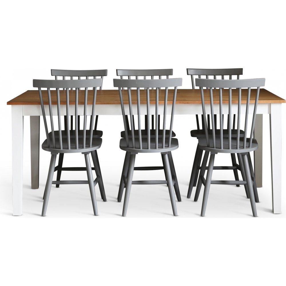 Dalsland-ruokailuryhmä: Ruokapöytä tammi/valkoinen ja 6 harmaata ruokotuolia