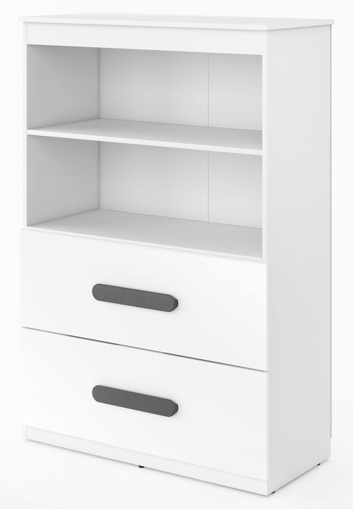 Tyylikäs ja moderni kirjahylly. Valmistettu MDF:stä kiiltävän valkoisella etuosalla ja varustettu todella hyvillä säilytystiloilla kahden leveän hyllyn ja kahden laatikon muodossa.