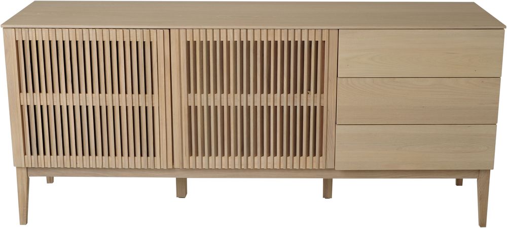 Darell-sarja sisältää valikoiman vitriinikaappeja ja -kaappeja. Tämä senkki on valmistettu saarniviilusta (MDF), paitsi ovet ja pohja, jotka on valmistettu massiivitammesta.