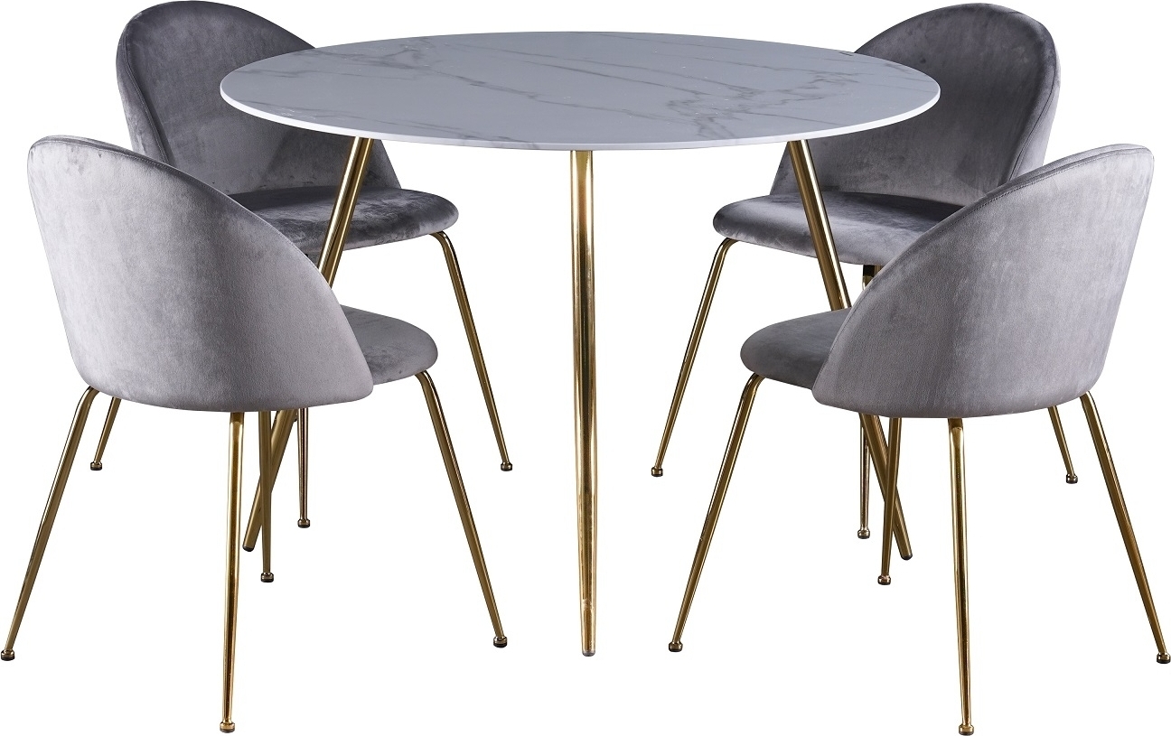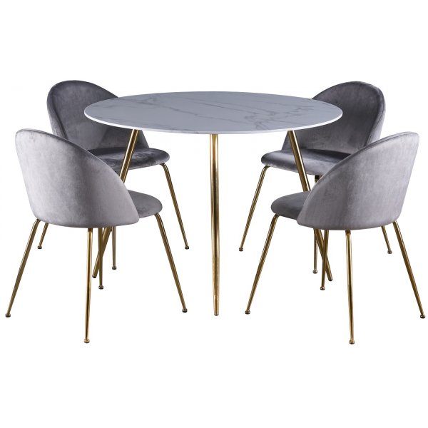 Deco ruokailuryhmä 110 cm pyöreä pöytä + 4 kpl Art tuoleja harmaa sametti / Messinki