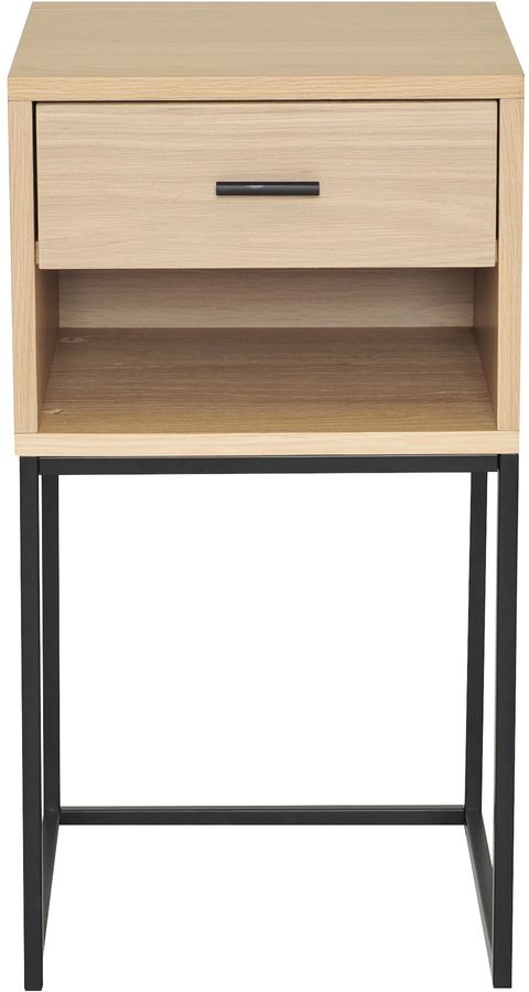 Yöpöytä laatikolla ja hyllyllä valkoista pigmentoitua tammiviilua ja alakehys mustaksi lakattua metallia.