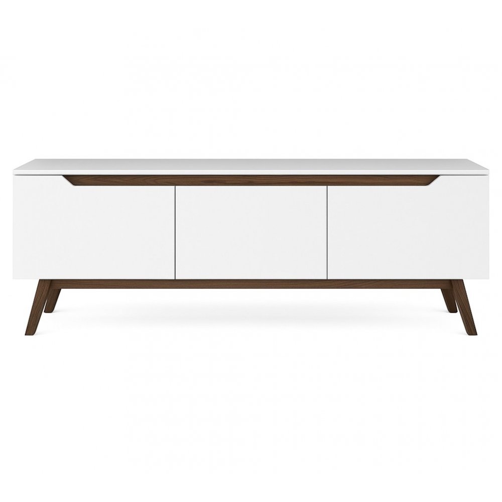 Moderni valkoinen mediapenkki pähkinäpuisilla yksityiskohdilla. Tyylikäs yhdistelmä tekee mediapöydästä helposti sijoitettavan. Mediapenkissä on hyvin säilytystilaa kolmen oven takana.