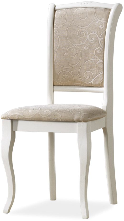 Upea ja elegantti ruokatuoli. Runko on valmistettu valkoiseksi lakatusta puusta ja istuin on verhoiltu erittäin miellyttävällä kankaalla.