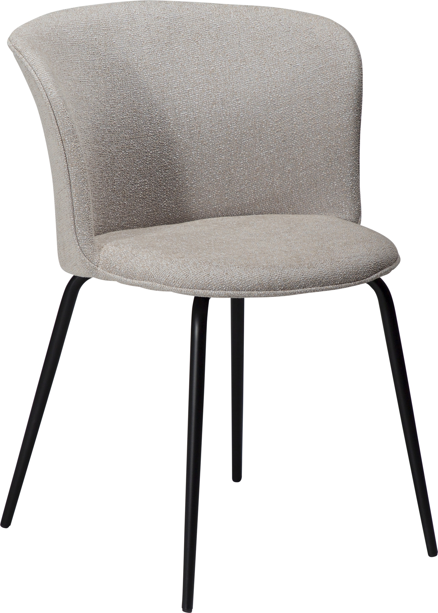 Tyylikäs täysin verhoiltu ruokatuoli pyöristetyllä selkänojalla ja kapeilla, kartiomaisilla metallijaloilla.