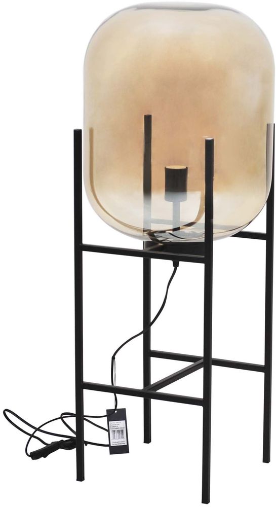 Tyylikäs ja retrosti muotoiltu jalkalamppu. Jalka on valmistettu mustasta metallista ja kupu on kirkasta lasia. Katkaisin on johdossa.