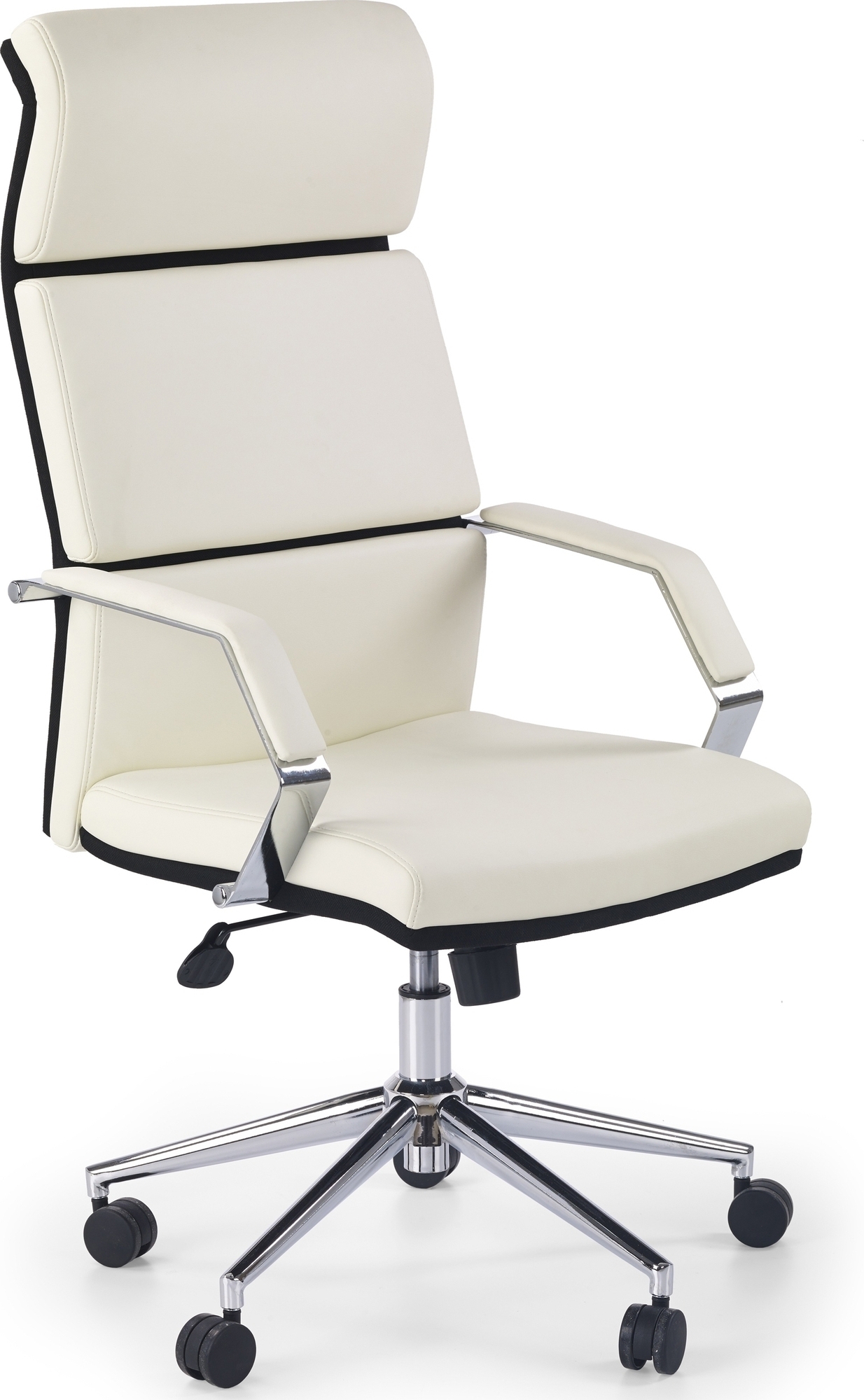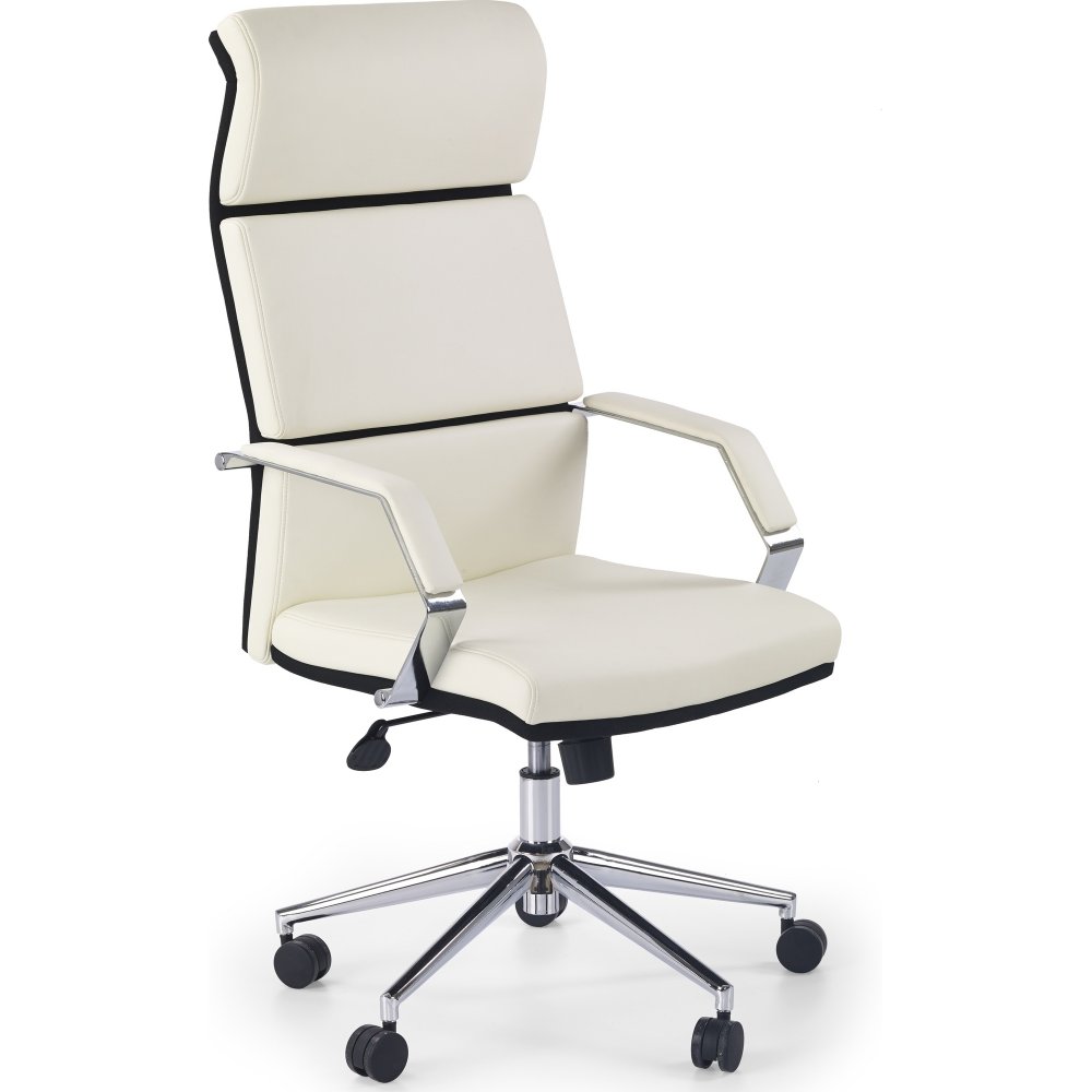 Tyylikäs toimistotuoli miellyttävällä muotoilulla. Valmistettu kromatusta metallista, jossa tyylikäs valkoinen keinonahkaverhoilu. Helppo liikuttaa kromatun tähtijalustan pyörien, säädettävän korkeuden sekä tuolin kääntymisen ja kallistuksen ansiosta.