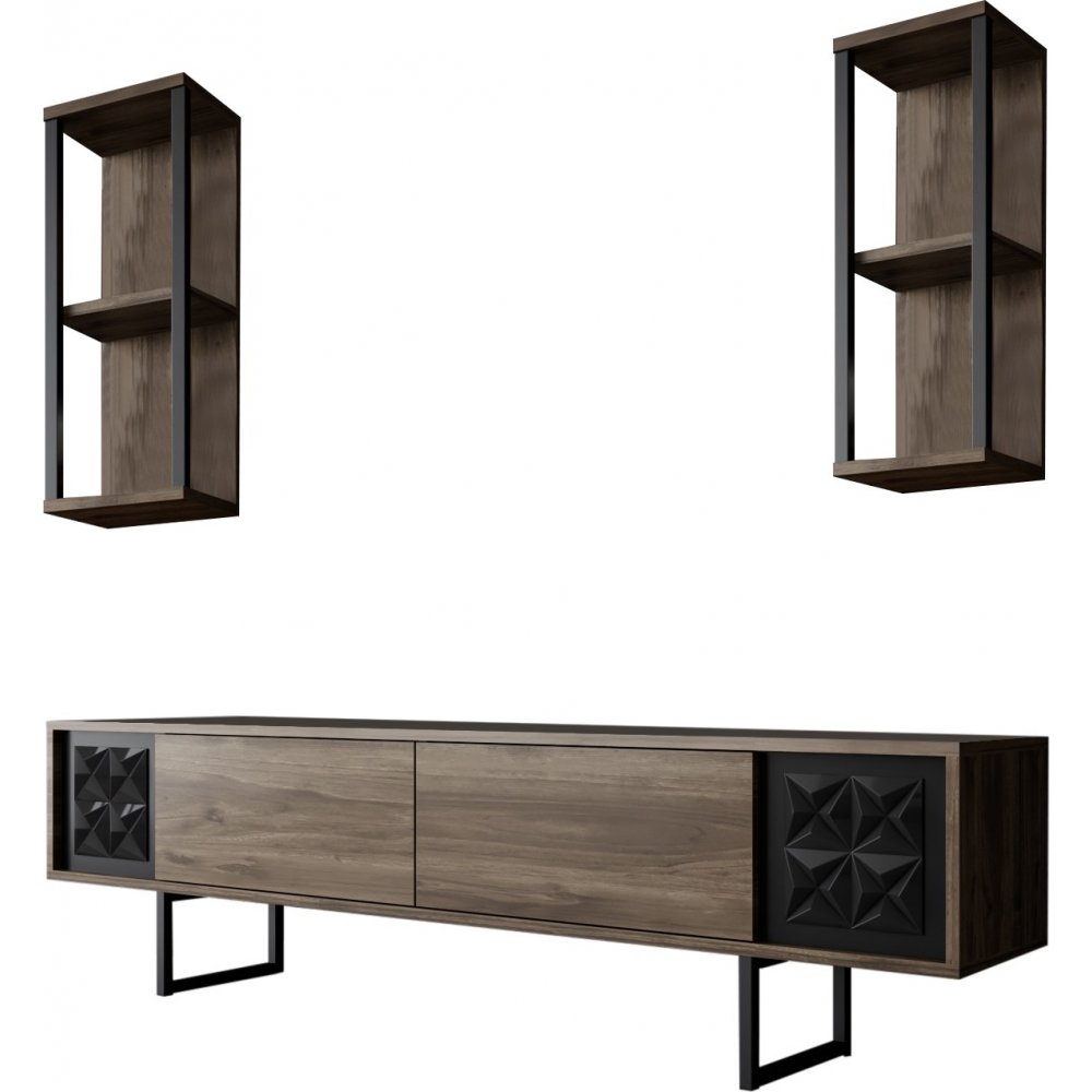 Mediapenkki ja seinähyllyt melamiinipinnoitetusta lastulevystä metallijaloilla.