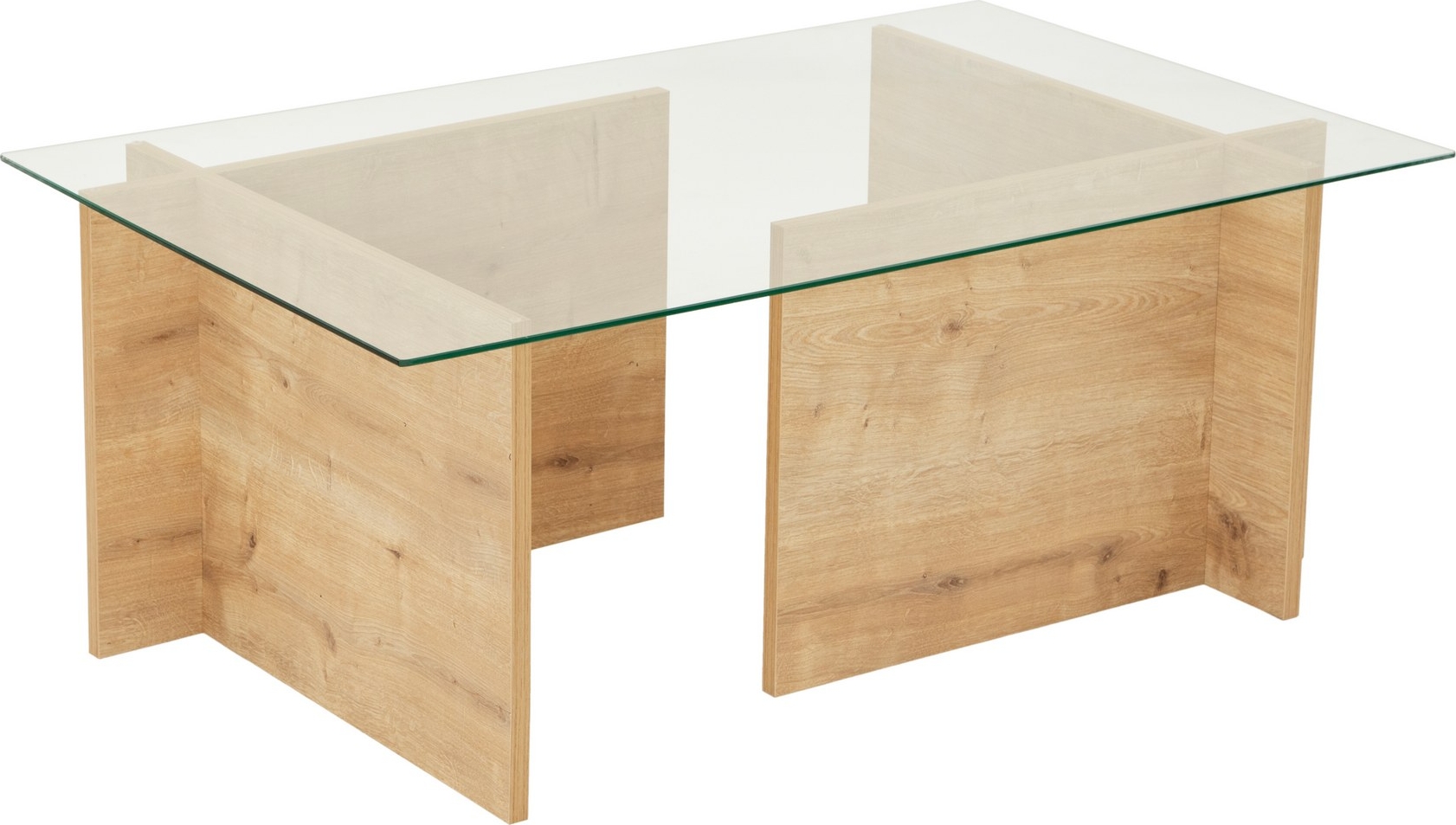 Melamiinipinnoitetusta lastulevystä valmistettu sohvapöytä. Pöytälevy karkaistua lasia.