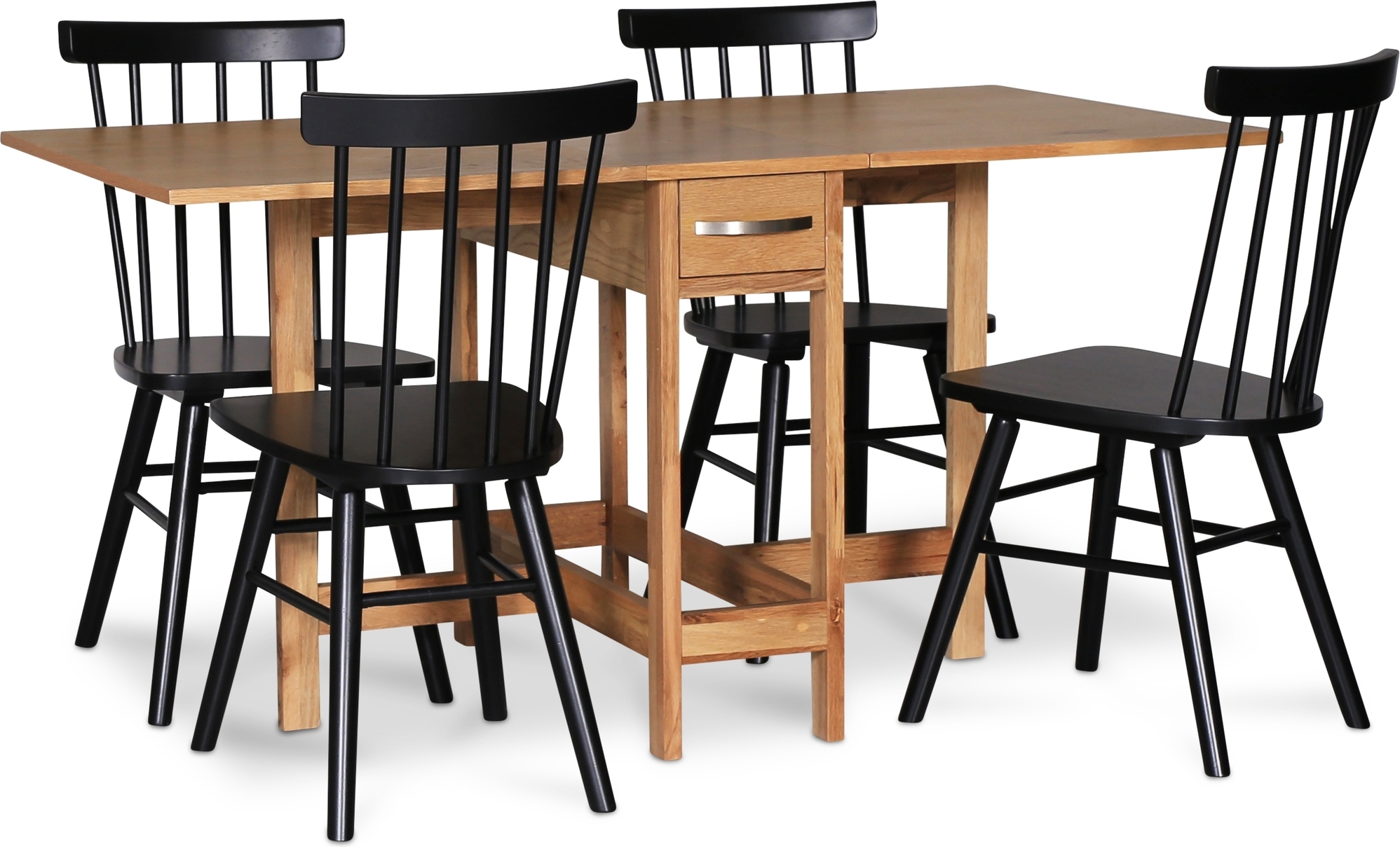 Fårö-ravintolaryhmä klassisessa designissa. Fårö taittopöytä ja 4 yhteensopivaa mustaa Orust-ruokotuolia.