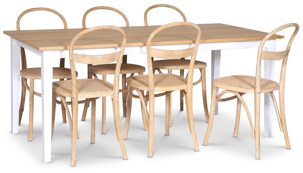 Fårö ruokaryhmä; ruokapöytä 180x90 cm - Valkoinen/öljytty tammi ja 6 Danderyd No.16 tuolia Whitewash