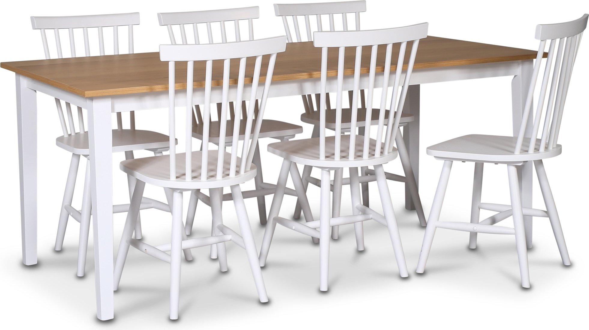 Fårö-ruokailuryhmä Skånska Möbelhusetilta, klassinen ruokapöytä 180x90 cm, valkoinen pohja ja kansi öljyttyä tammiviilua. Sisältää 6 yhteensopivaa Karl-tuolia valkoiseksi lakattua puuta.