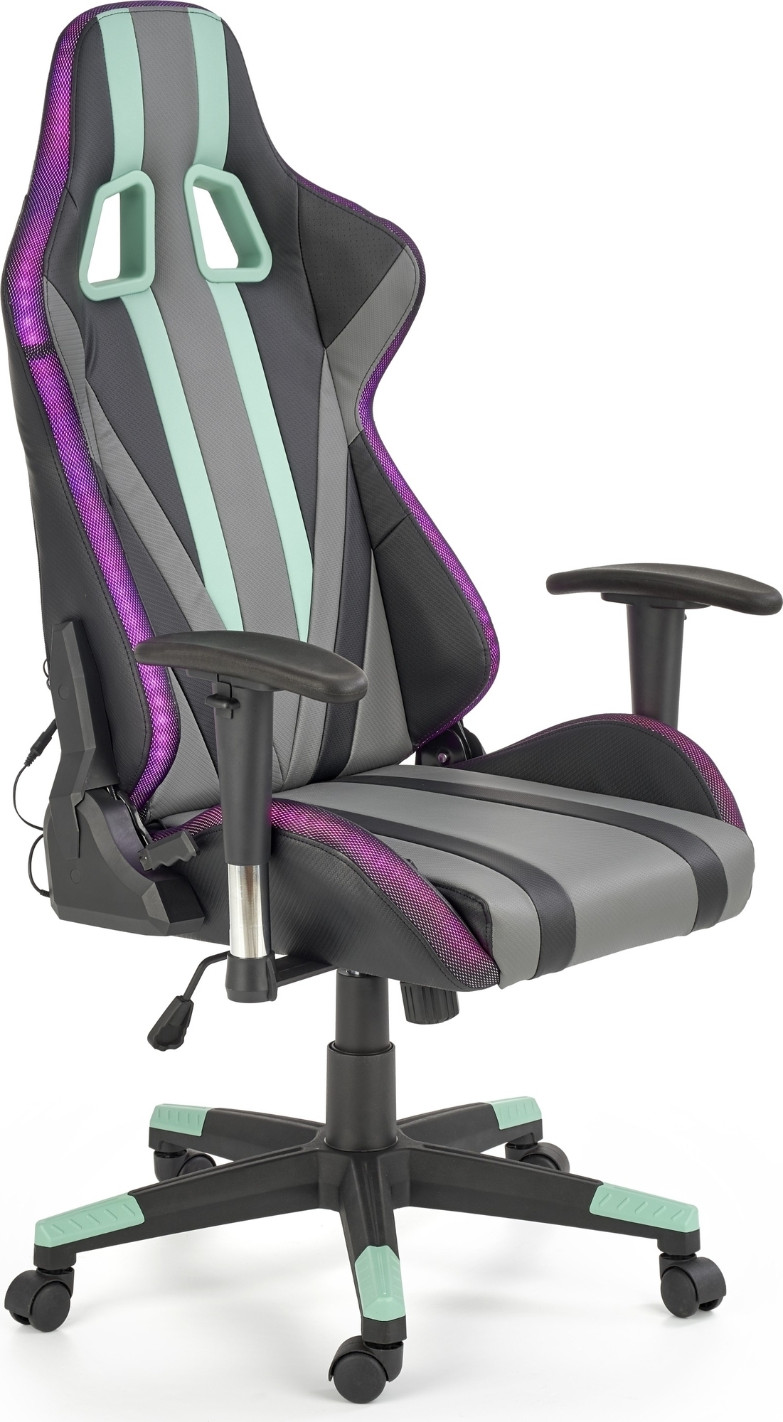 Pelituoli LED-valolla ja sisäänrakennetuilla bluetooth-kaiuttimilla. Pohja polypropeenista (PP). Verhoilu ekonahkaa ja kalvokangasta.