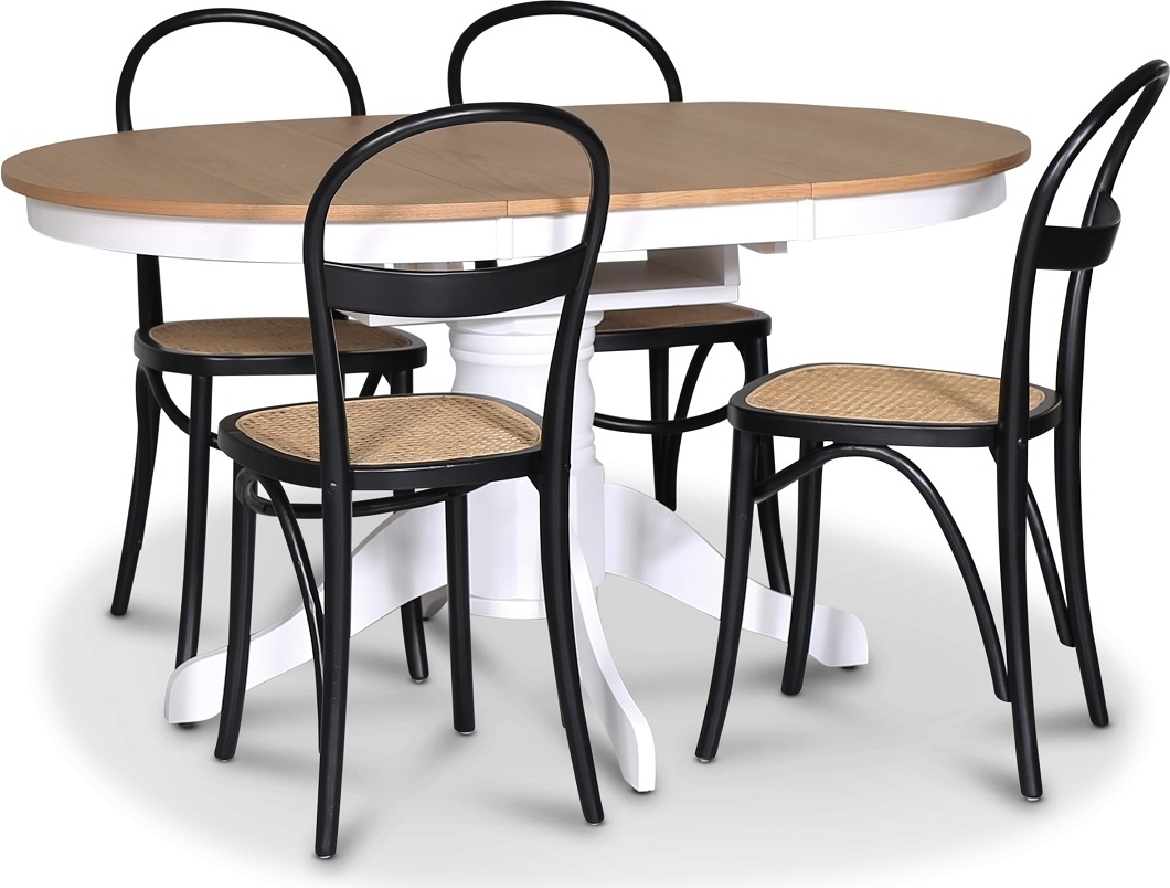 Fitchburg Food Group; Soikea ruokapöytä 106-141 cm - Valkoinen / Öljytty tammi ja 4 Danderyd No.16 ruokapöydän tuolia musta