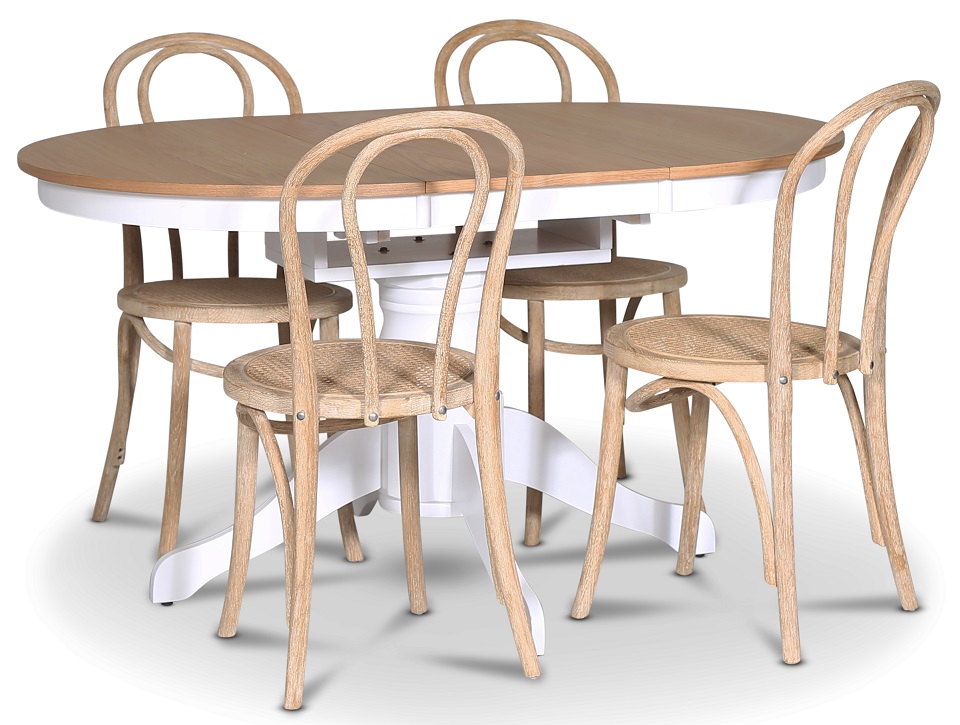 Fitchburg Food Group; Soikea ruokapöytä 106-141 cm - Valkoinen / Öljytty tammi ja 4 Danderyd No.18 ruokapöydän tuolia Whitewash