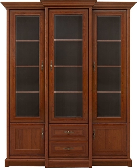 Suuri ja kaunis kastanjanvärinen vitriinikaappi koristeellisilla kahvoilla. Kaapissa on keskellä kaksi laatikkoa ja reunoilla pienet kaapit pienempien esineiden säilyttämiseen. Vitriinin takana on monia hyllyjä, joissa pysyy tavarat helposti järjestyksessä.