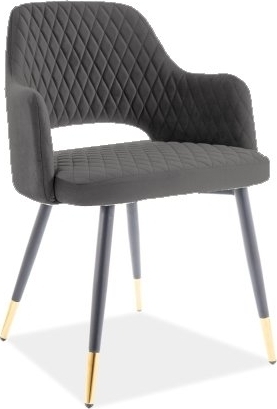 Metallinen ruokapöydän tuoli. Verhoiltu samettijäljitelmäkankaalla.